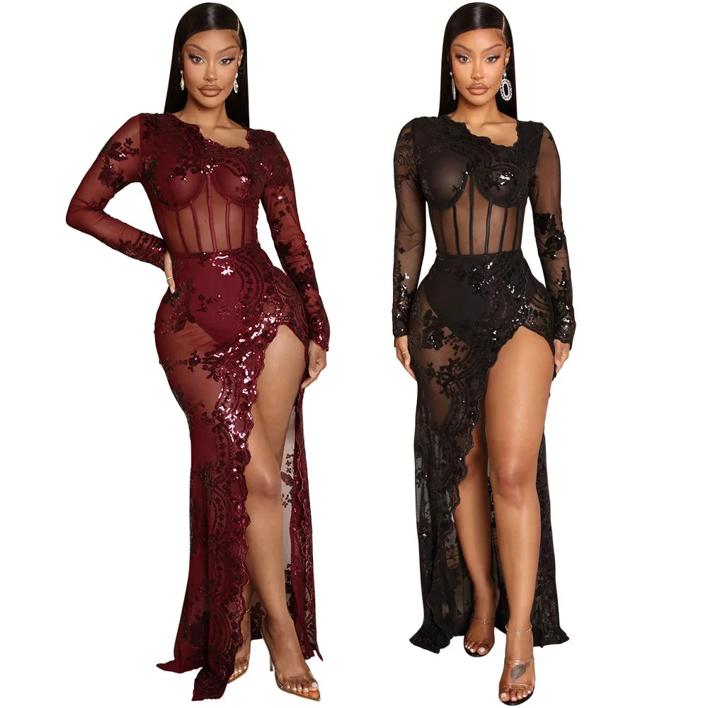 Women Sequined Mesh See Through Long Sleeve Bodycon Long Maxi Dress 2024 Sexy Night Party Evening Prom Dresses Vestidos