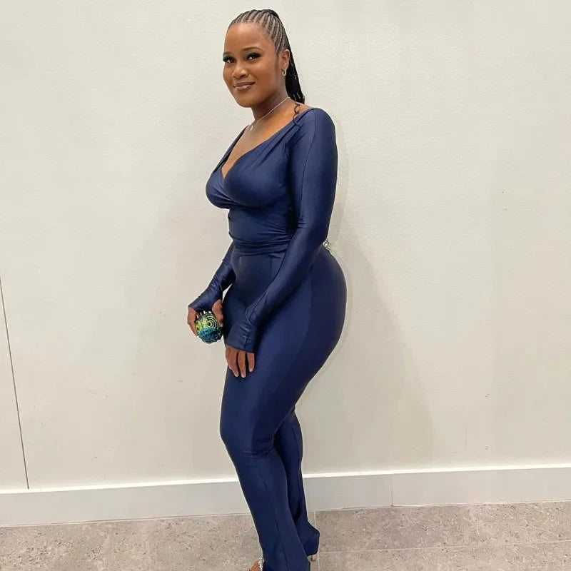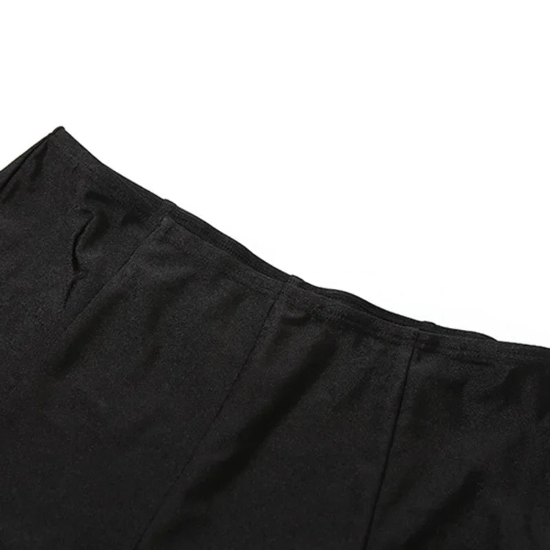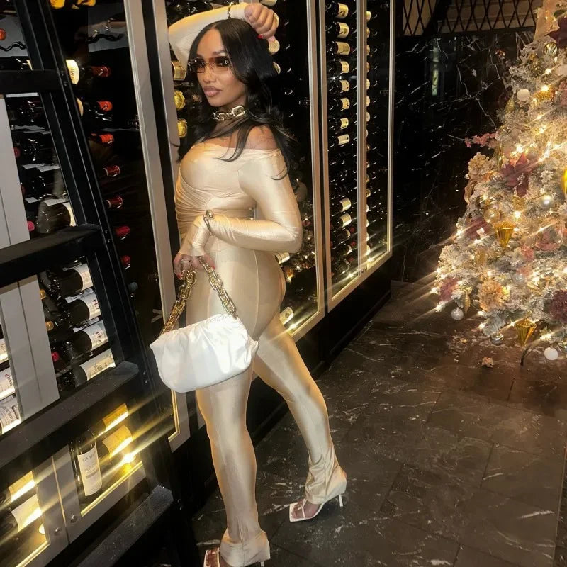 Women Solid Glossy 2 Piece Set Wrap V Neck Gloves Long Sleeve Off Shoulder Slim T-shirts Tops Split Flare Pants Streetwear Suits